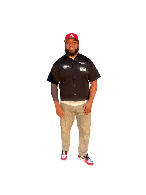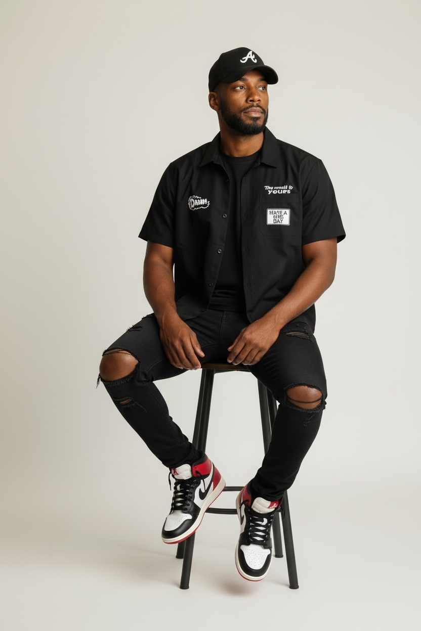The patches, clean black base, and big back print make it feel like a mix of streetwear + mechanic/work shirt aesthetic.